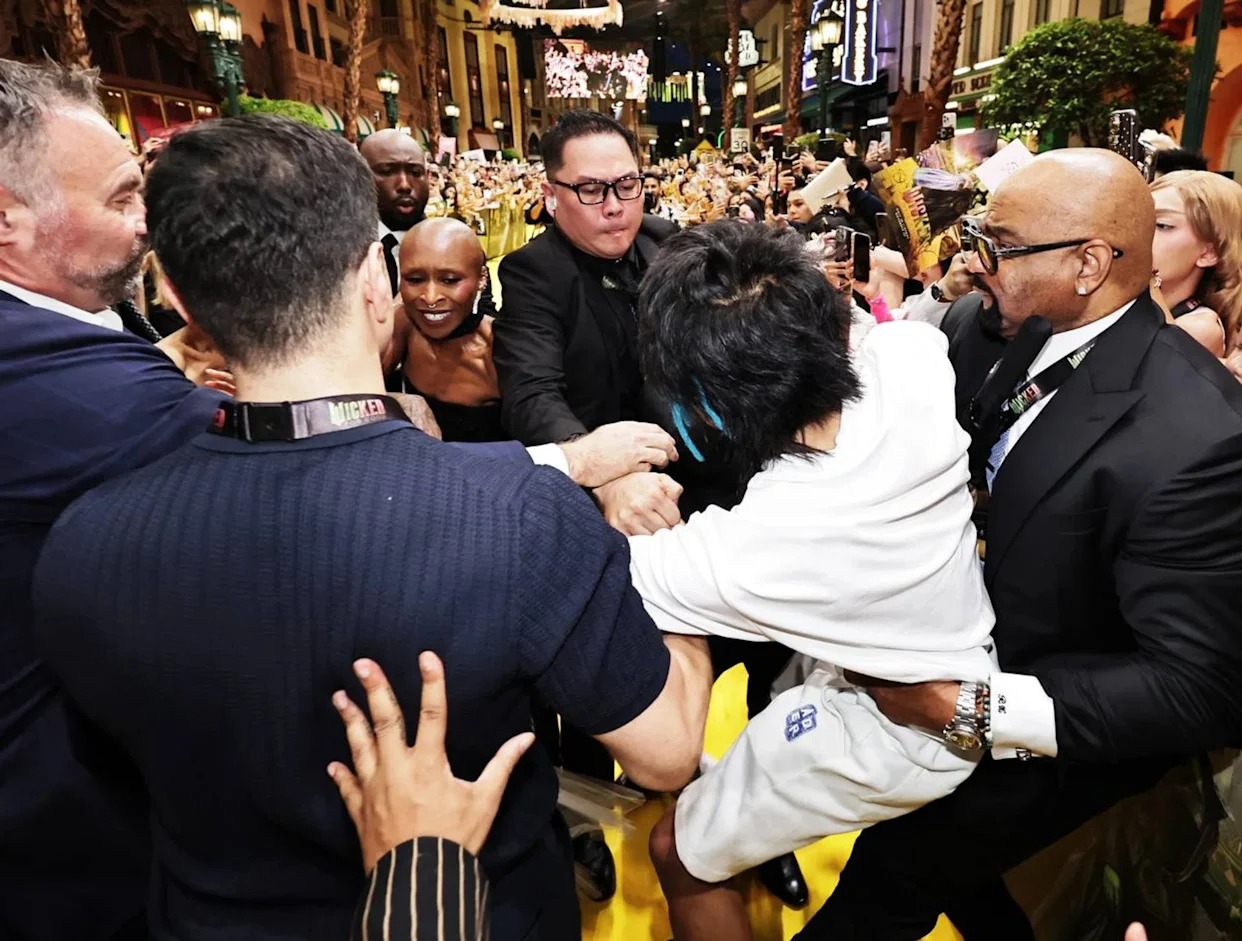 O cidadão australiano Johnson Wen pulou a barreira em uma reunião de fãs com o elenco de Wicked: For Good em 13 de novembro e foi prontamente detido pela segurança. Foto: Reprodução