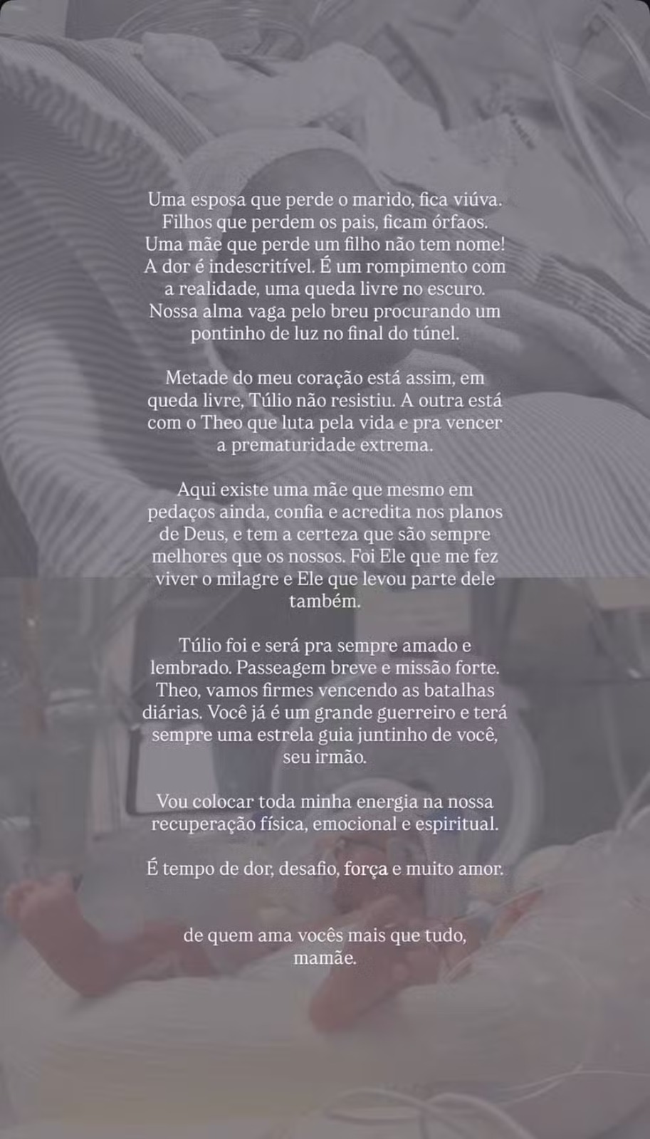 "Metade do meu coração está assim, em queda livre, Túlio não resistiu. A outra está com o Theo que luta pela vida e para vencer a prematuridade extrema. Aqui existe uma mãe que mesmo em pedaços ainda confia e acredita nos planos de Deus e tem a certeza que são sempre melhores que os nossos. Foi Ele que me fez viver o milagre e Ele que levou parte dele também", relatou.