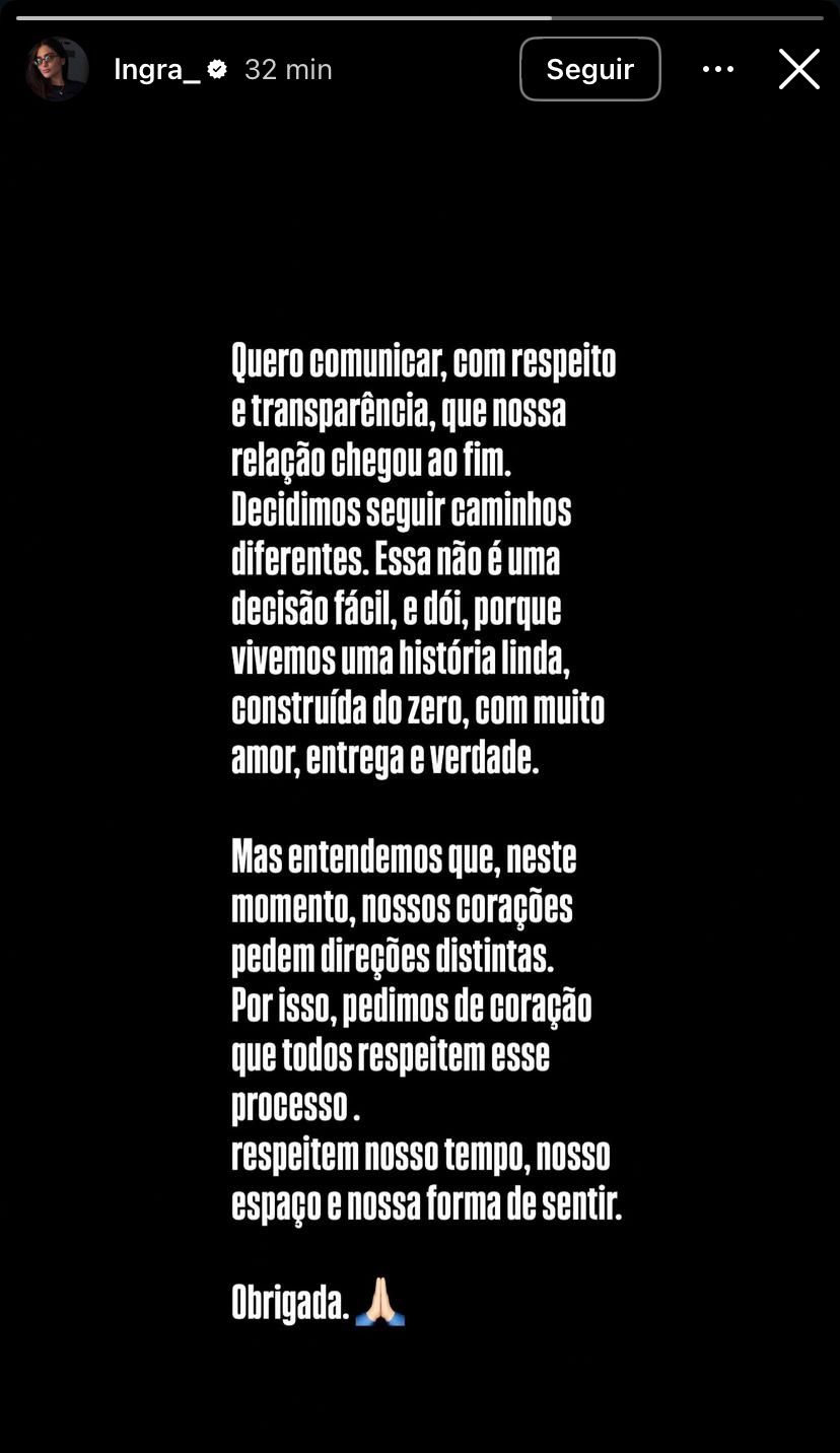 No comunicado, ela informou que a decisão foi tomada em comum acordo. “Quero comunicar, com respeito e transparência, que nossa relação chegou ao fim. Decidimos seguir caminhos diferentes. Essa não é uma decisão fácil, e dói, porque vivemos uma história linda, construída do zero, com muito amor, entrega e verdade”, escreveu. Em seguida, pediu privacidade: “Neste momento, nossos corações pedem direções distintas. Por isso, pedimos de coração que todos respeitem esse processo. Respeitem nosso tempo, nosso espaço e nossa forma de sentir. Obrigada.”