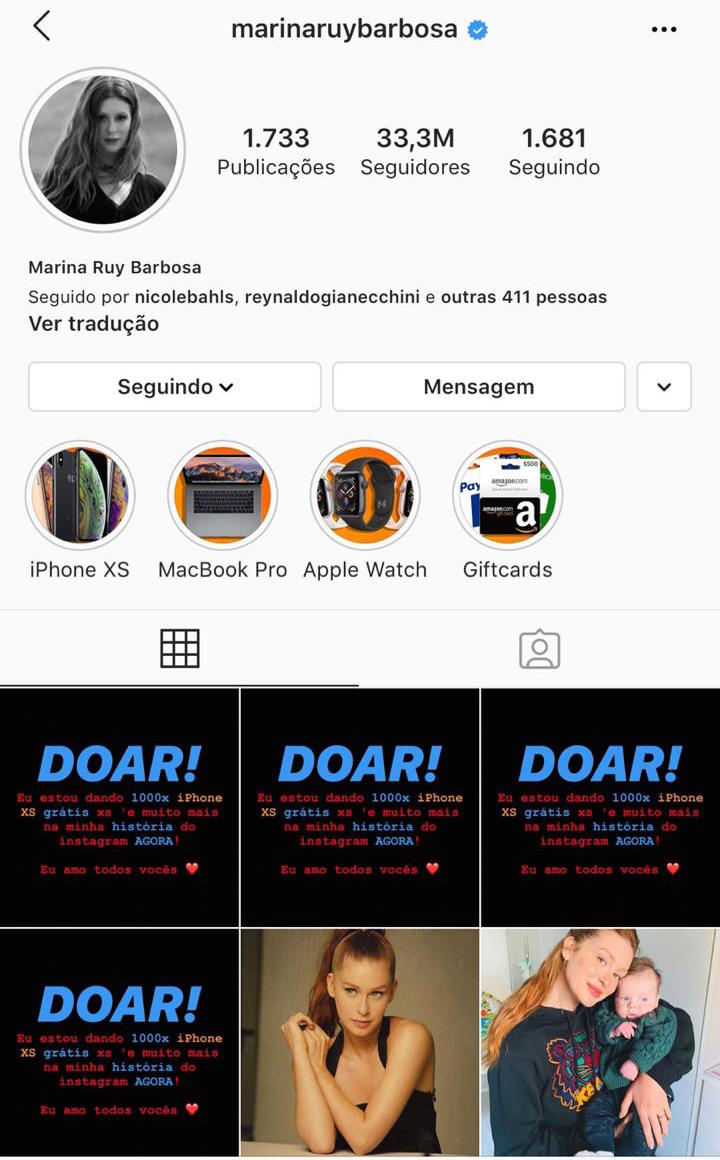 Na madrugada desta terça-feira (16), os fãs de Marina Ruy Barbosa se assustaram com publicações estranhas realizadas em sua conta de Instagram. O perfil da atriz, que conta atualmente com 33,3 milhões de seguidores, havia divulgado peças de promoções indicando que ela doaria smartphones e notebooks mediante a cliques em links disponibilizados em seus stories. As informações são da Uol.