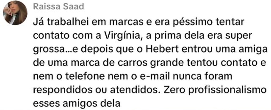 “Já trabalhei em marcas e era péssimo tentar contato com a Virgínia. A prima dela era super grossa... E depois que o Hebert entrou, uma amiga de uma marca de carros grande tentou contato e nem o telefone nem o e-mail nunca foram respondidos ou atendidos. Zero profissionalismo esses amigos dela”, afirmou.
