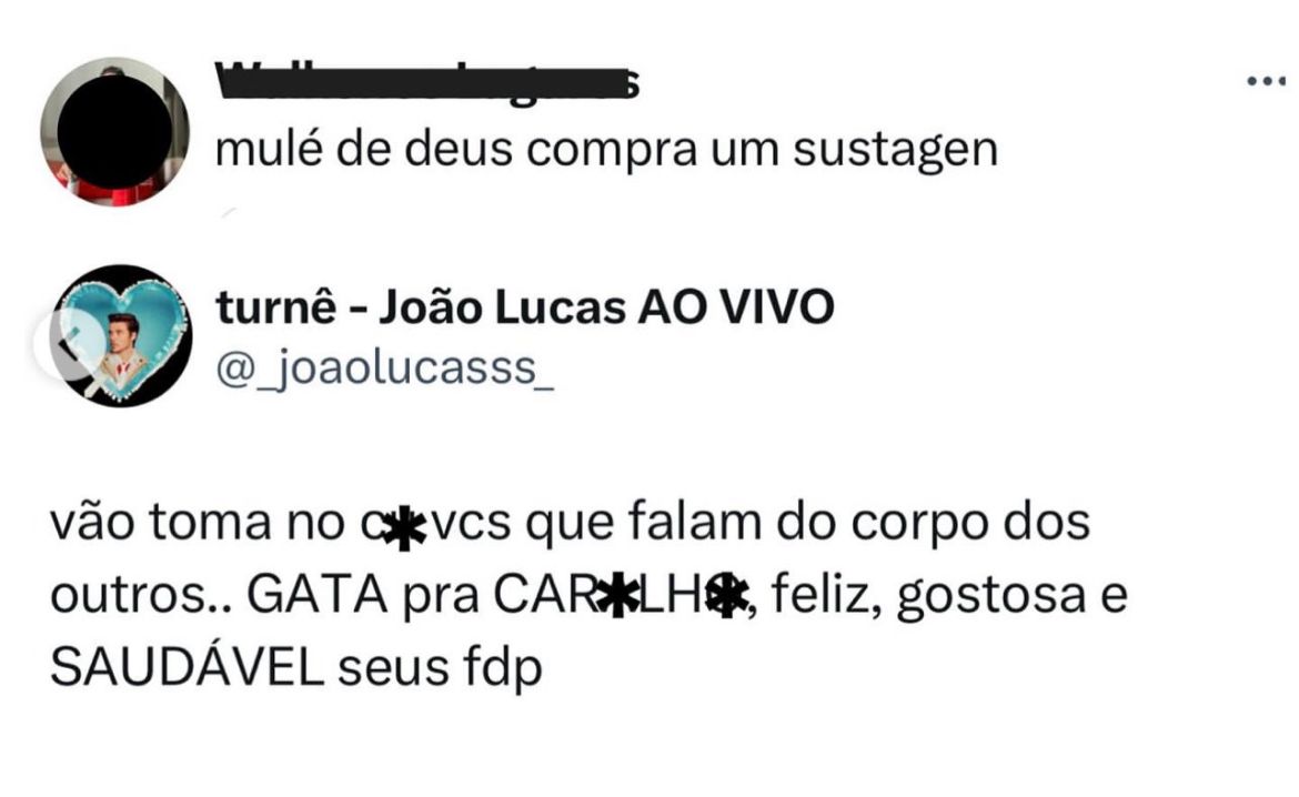 Alguns perfis nas redes sociais fizeram observações sobre o físico de Sasha, incluindo comentários do tipo “Mulé de Deus, compra um sustagen”. João Lucas respondeu de forma enfática e sem rodeios.