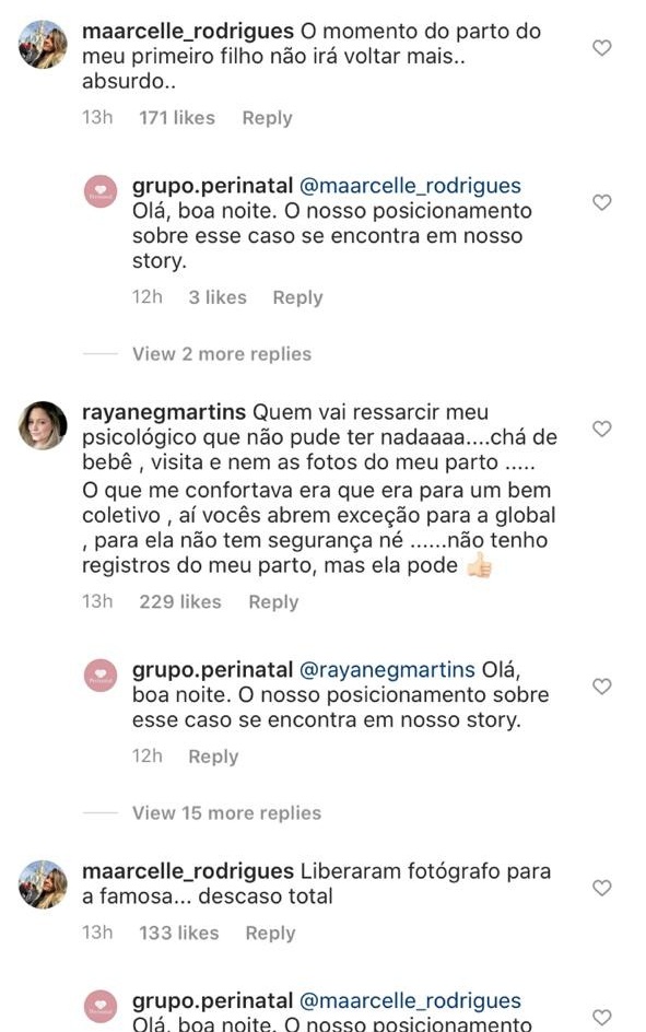 Internautas se manifestaram na última publicação feita pelo Grupo Perinatal na rede social. "Direitos iguais para todas as mães! Exceção pra uma famosa, que chacota né?", disse uma seguidora. "Absurdo! Eu liguei dias antes do meu parto, para me certificar se já estava liberado e a reposta que tive foi: Não, devido a pandemia! Expliquei que seria minha irmã fotógrafa, que mora comigo, iria fazer as fotos e mesmo assim não liberaram. Meu marido, o acompanhente, que teve fazer as fotos no calor da emoção. E agora isso? Desrespeito!", indignou-se outra.
