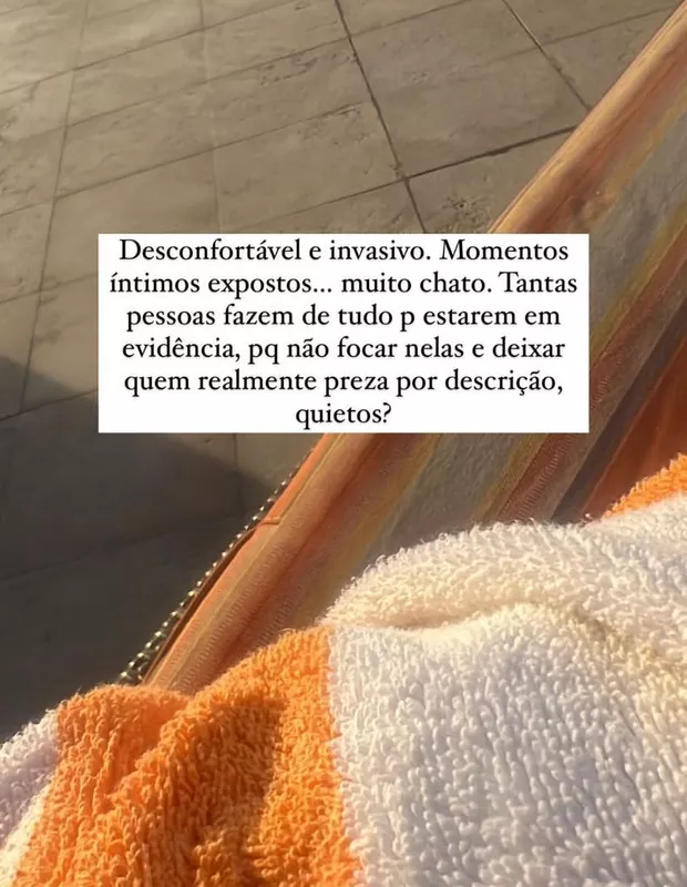 "Desconfortável e invasivo. Momentos íntimos expostos, muito chato. Tantas pessoas fazem de tudo para estarem em evidência, por que não focar nelas e deixar quem realmente preza por descrição quietos?", questionou a estudante. Os dois terminaram o noivado em agosto do ano passado.