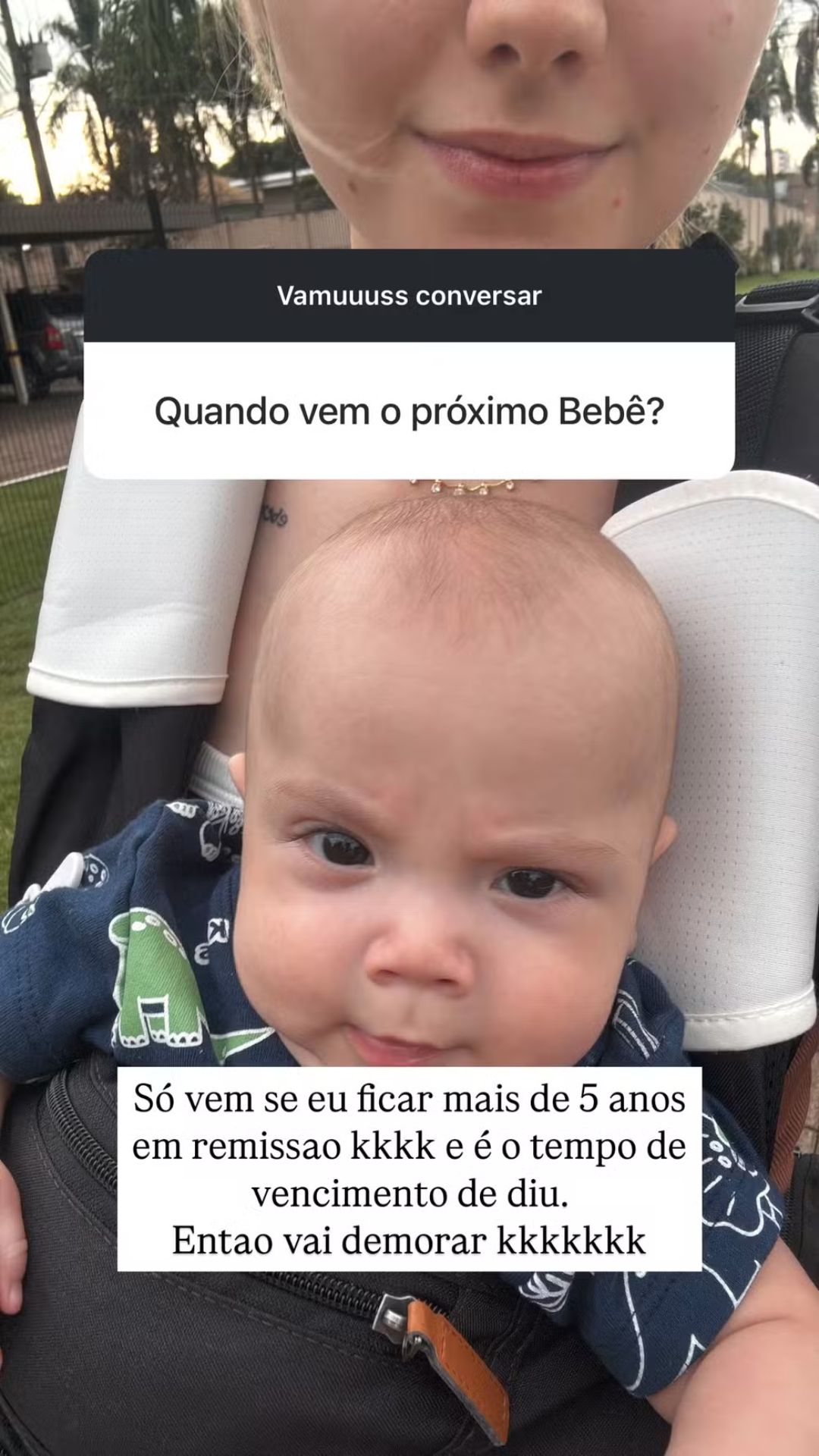 Também mencionou que, atualmente, não pretende engravidar novamente. "Só vem [um próximo bebê] se eu ficar mais de cinco anos em remissão (risos). E é o tempo de vencimento do DIU. Então vai demorar", comentou, destacando que é casada com Lucas Borbas.