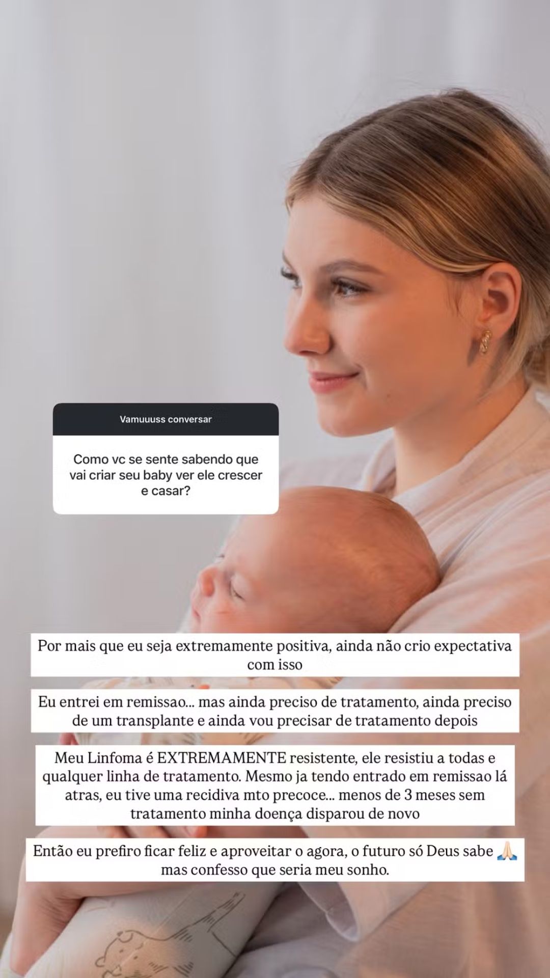 Isabel Veloso, de 19 anos, contou que não tem esperanças de acompanhar o crescimento do filho, Arthur, que tem 5 meses. Ao abrir uma caixa de perguntas no Instagram, recebeu de uma seguidora a mensagem de que ainda verá o menino se casar. Em resposta, disse que, embora esteja com o câncer em remissão, a enfermidade continua resistente.