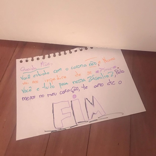 "'Querida mãe, você estando com o corona ou não, nunca vai nos impedir de te amar. Você é tudo pra nossa família, pelo menos no meu coração. Te amo até o fim'. Bilhetinho que o Arthur deixou por debaixo da porta. Te amo, filho", postou a apresentadora.