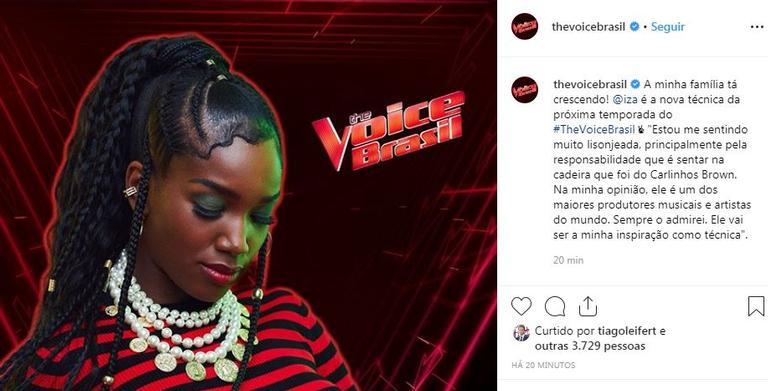No Instagram oficial do reality, os produtores reveleram de quebra que ela ocupará a cadeira de Carlinhos Brown. "A minha família tá crescendo! Iza é a nova técnica da próxima temporada do The Voice Brasil!".