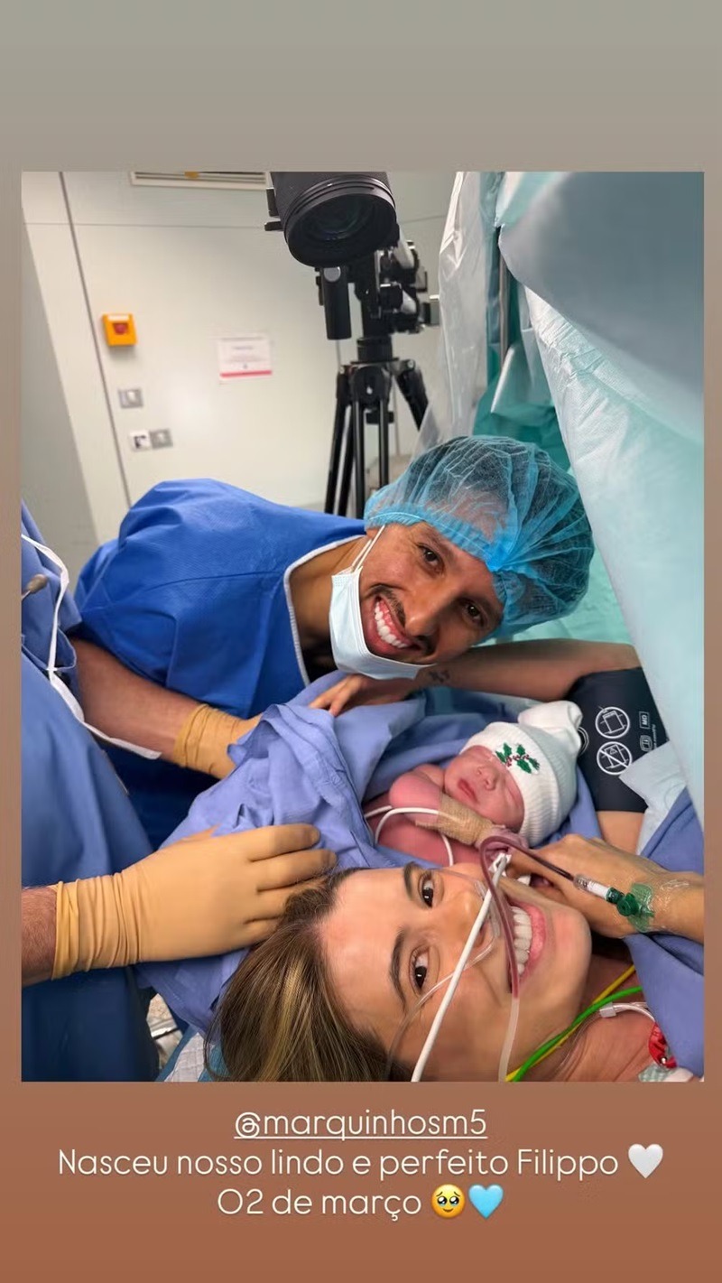 “Nasceu nosso lindo e perfeito Filippo. 02 de março”, escreveu Carol nas redes sociais ao publicar uma foto tirada logo após o parto.