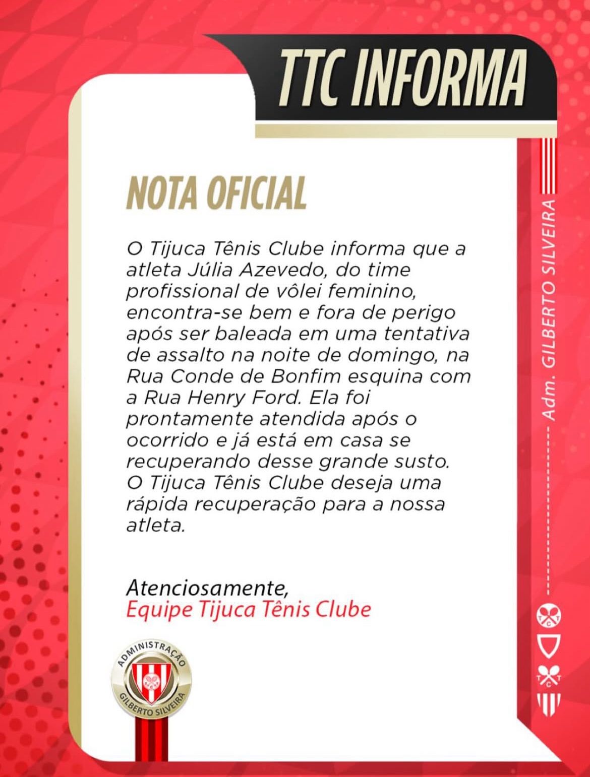O projétil passou a apenas 1 milímetro da coluna e 1 centímetro da bexiga, sem atingir nenhum órgão, uma diferença mínima que evitou consequências graves. Após receber alta, Júlia cumpre repouso em casa e segue em monitoramento médico. Em nota, o Tijuca lamentou o caso.