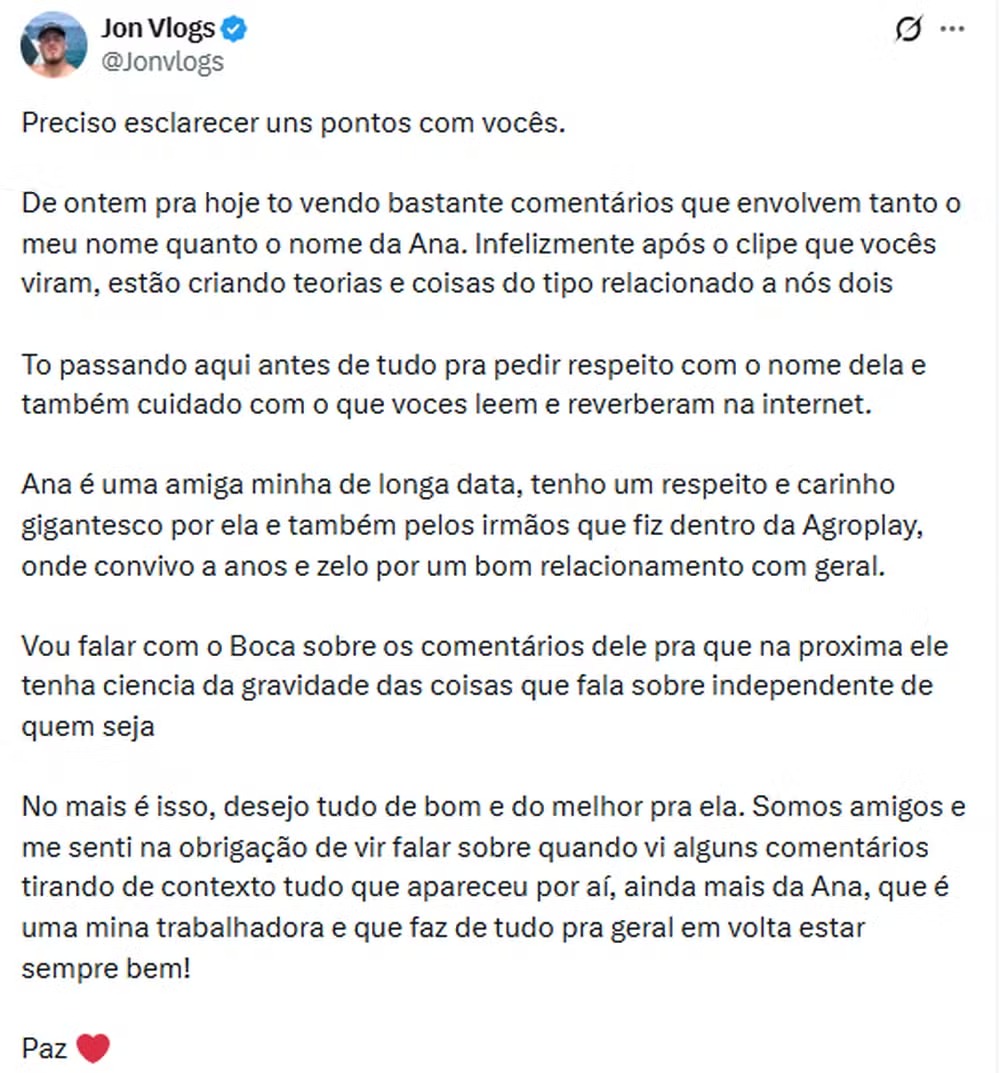 Jon deixou claro que não está vivendo um romance com Ana. "Desejo tudo de bom e do melhor pra ela. Somos amigos e me senti na obrigação de vir falar sobre quando vi alguns comentários tirando de contexto tudo que apareceu por aí, ainda mais da Ana, que é uma mina trabalhadora e que faz de tudo pra geral em volta estar sempre bem!", finalizou.