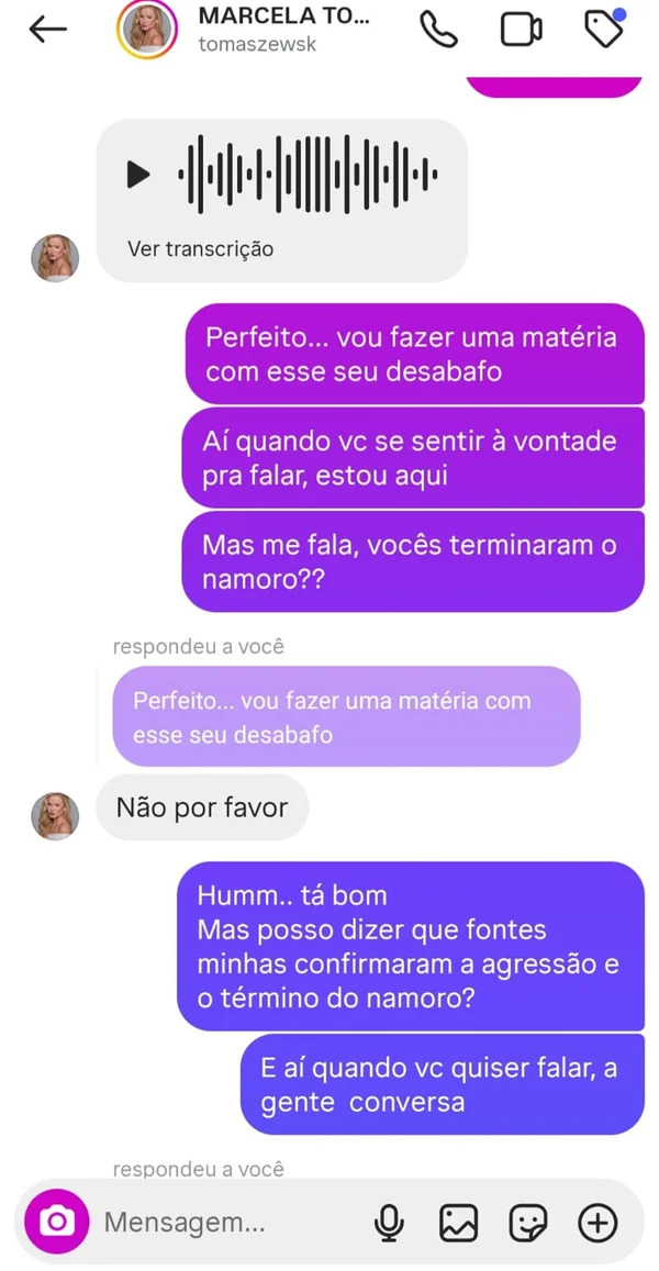 A colunista Fábia Oliveira divulgou, neste sábado (25), mensagens atribuídas a Marcela Tomaszewski, nas quais a modelo confirma o fim do relacionamento com Dado Dolabella. As conversas foram divulgadas após o casal aparecer nas redes sociais negando o fim do namoro e dizendo que estava tudo bem.