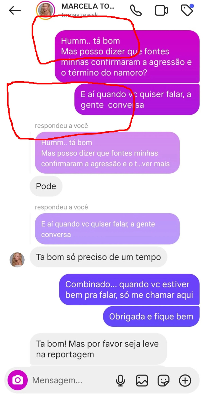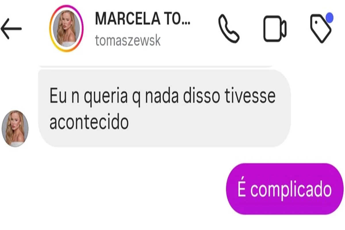 Segundo Fábia Oliveira, Marcela autorizou a publicação “em caráter reservado” antes das negativas públicas. Na troca de mensagens, a modelo lamenta a repercussão: “Gostaria de não falar a respeito disso. Porque, pelo visto, vazou o que não deveria. Infelizmente, as coisas não são só flores. Só preciso digerir tudo o que está acontecendo hoje”, escreveu. Ela também afirmou: “Eu não queria que nada disso tivesse acontecido.”