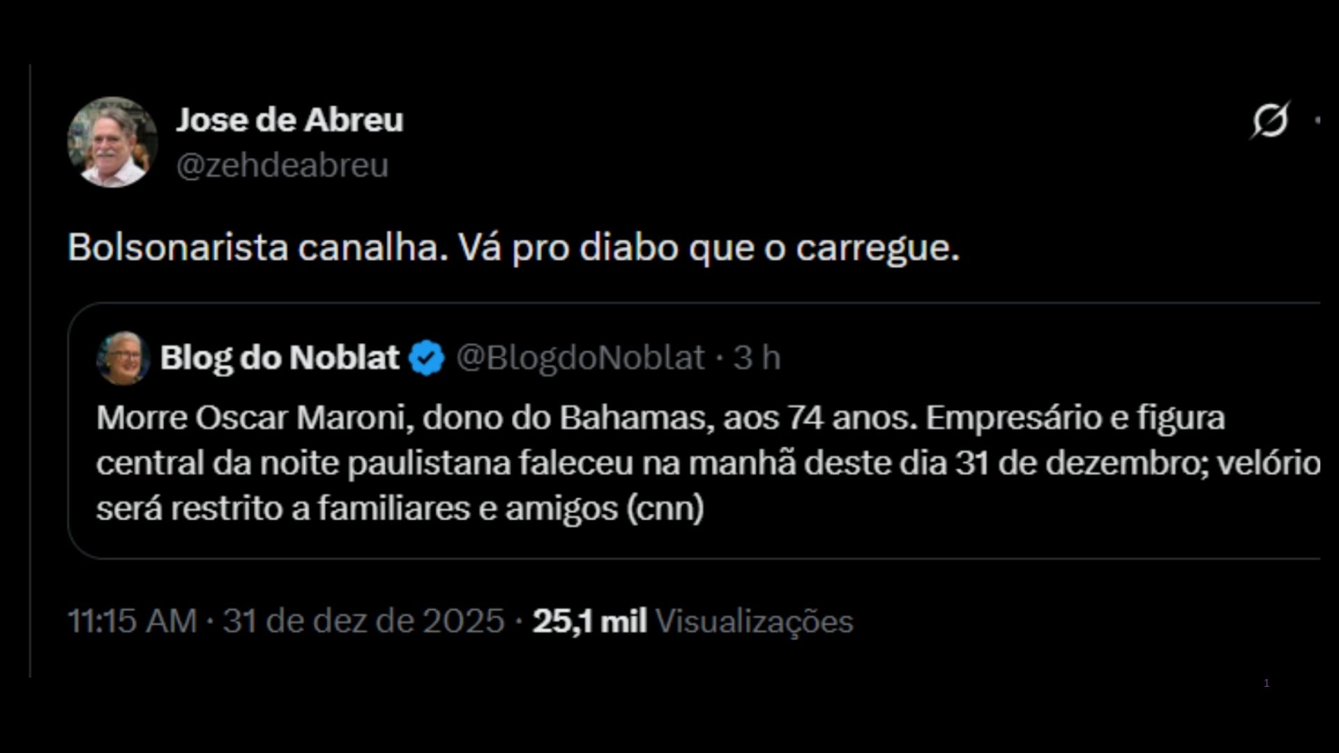 José de Abreu causou polêmica nas redes sociais nesta quinta-feira (31/12), ao usar seu perfil no X, antigo Twitter, para comentar a morte do empresário Oscar Maroni, em São Paulo. O ator reagiu de forma irônica à notícia do falecimento, aos 74 anos, lembrando o alinhamento político do empresário ao ex-presidente Jair Bolsonaro e publicando uma mensagem que rapidamente repercutiu e gerou debates entre seguidores.