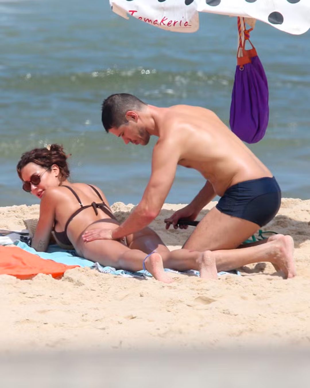 Após o mergulho, os dois decidiram renovar o bronzeado e passaram protetor solar antes de se deitarem na areia. Primeiro, Fernanda espalhou o produto no corpo do ator; depois, foi a vez de Loreto retribuir o gesto, em cenas que chamaram atenção pela intimidade, incluindo o momento em que ele aplica o creme no bumbum da parceira.