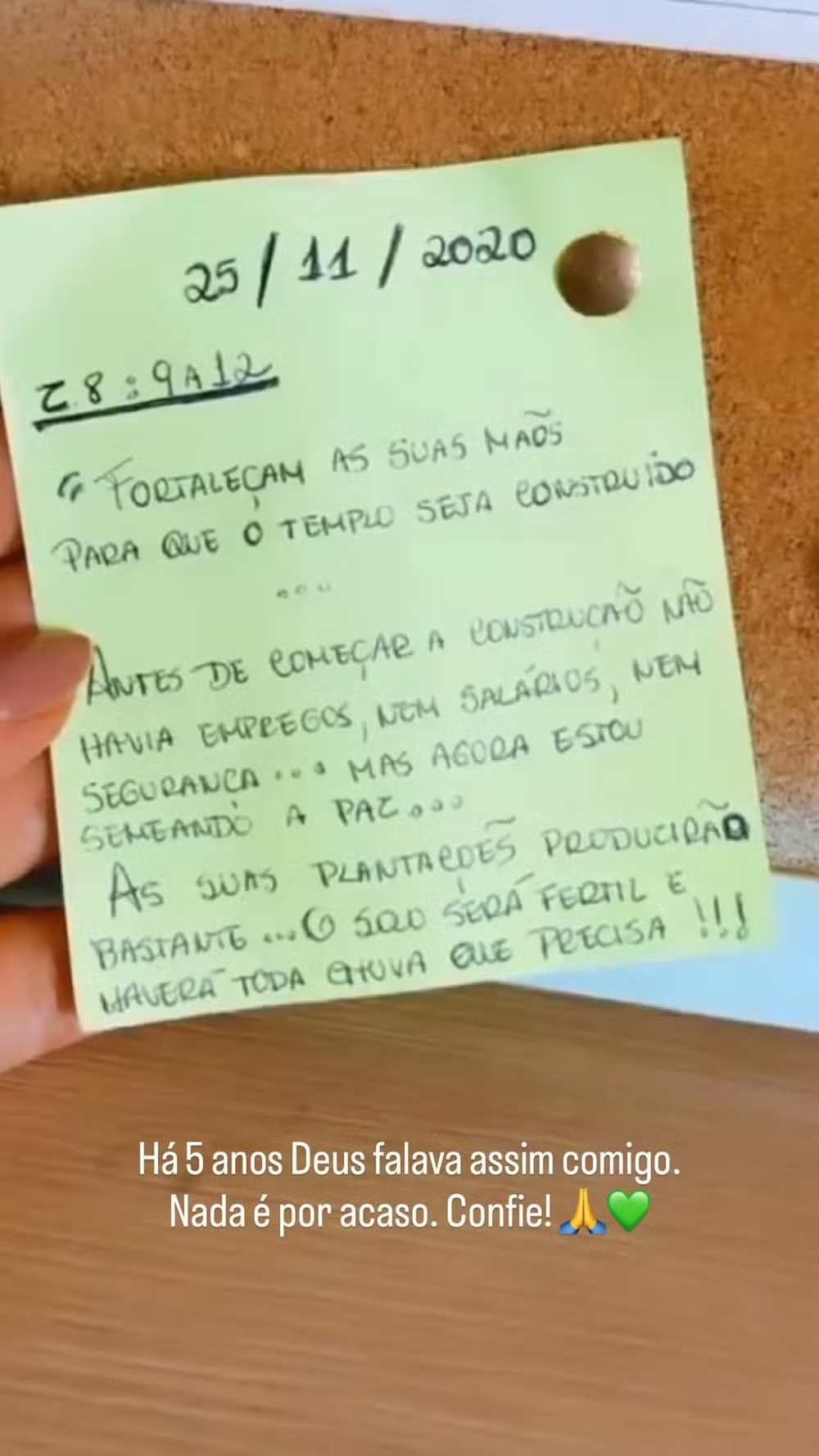 “Há cinco anos, Deus falava comigo. Nada é por acaso, confie”, escreveu ela ao compartilhar o registro nas redes sociais. O bilhete, datado de novembro de 2020, continha um trecho do livro de Zacarias: “Fortaleçam as suas mãos para que o templo seja construído”.