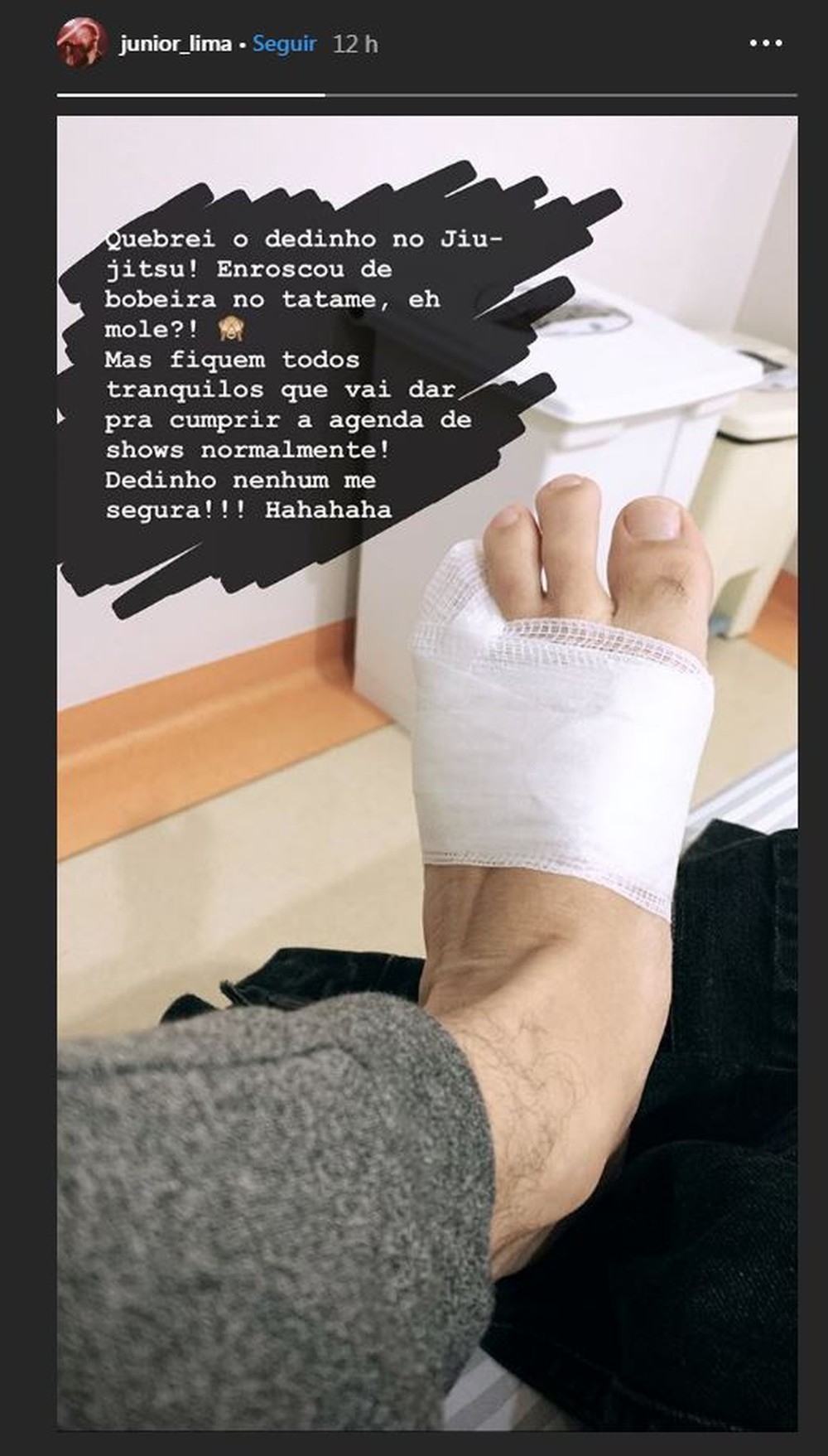 Junior Lima quebrou o dedinho do pé enquanto praticava jiu-jitsu. O cantor falou sobre o incidente no Instagram na noite desta quinta-feira (5) e compartilhou uma imagem em que aparece com o dedo enfaixado.