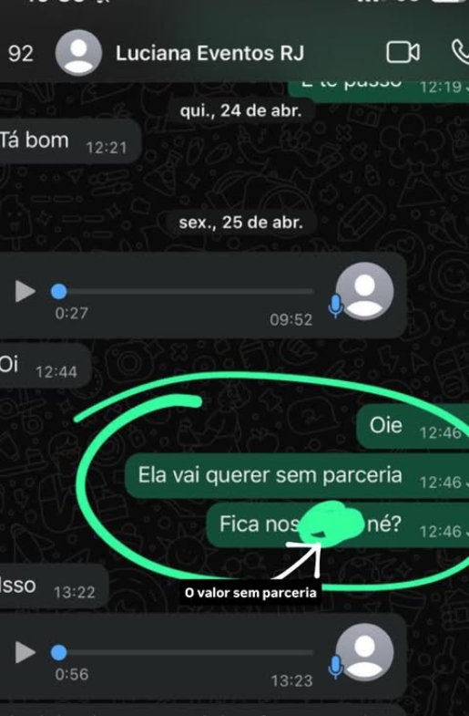 Karoline descobriu a situação após os fornecedores começarem a ligar para sua assessoria, cobrando as publicações prometidas. Eles enviaram áudios em que a organizadora afirmava que os serviços seriam pagos com posts em tempo real — algo que nunca foi acordado com Karoline.