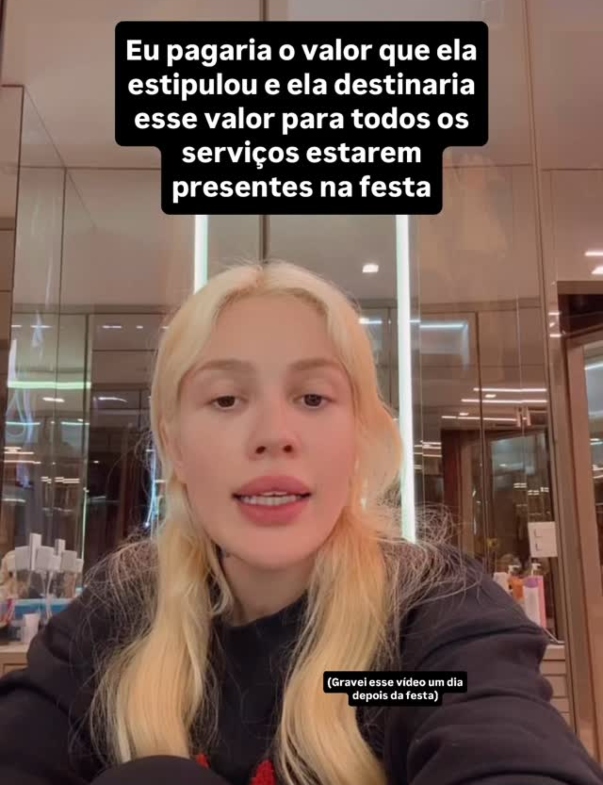 Ainda de acordo com Karoline, a mulher teria cobrado o valor restante ainda durante o evento, mas teria se apropriado do pagamento. “Antes de terminar a festa, a organizadora falou para eu fazer o restante do pagamento, que foi dividido em algumas vezes, porque ela queria acertar o restante com as pessoas que estavam ali. Foi o que fiz, paguei tudo para a moça. Não foi barato, mas ela não repassou o dinheiro para as pessoas (fornecedores). Ela prometeu para as pessoas que vieram fazer serviços na festa de alimentação, doces, recreação das crianças, animação das princesas, que o pagamento seria feito através das minhas divulgações, stories e post. Pegou o dinheiro para ela e não pagou ninguém. Sei disso porque entrei em contato com todos os fornecedores para saber se eles foram pagos. Não foi pago”, continuou.