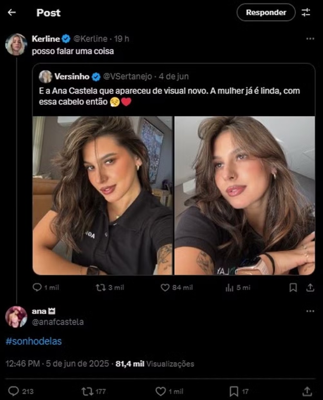 A ex-BBB Kerline, de 33 anos, surpreendeu os seguidores nesta quinta-feira (5) ao deixar um comentário em uma foto da cantora Ana Castela, de 21 anos, exibindo o novo visual. No X (antigo Twitter), a influenciadora deu em cima da sertaneja, que rapidamente respondeu a ela de forma bem-humorada.
