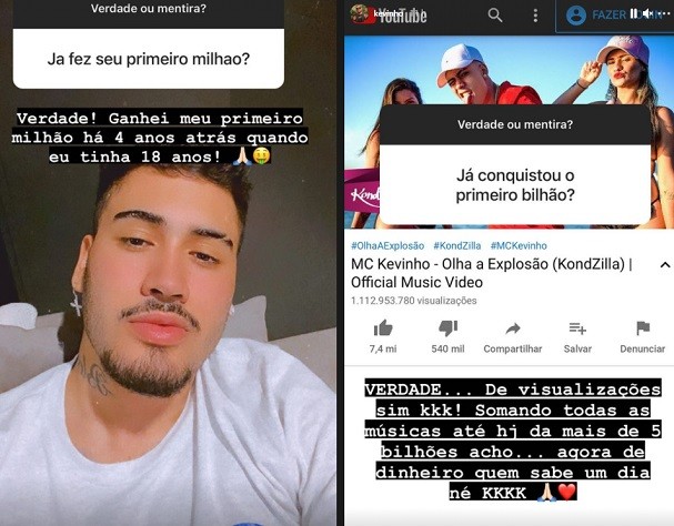 Outro fã questionou se ele já tinha seu primeiro bilhão. "Verdade...de visualizações, sim! Kkkk. Somando todas as músicas até hoje dá mais de 5 bilhões acho. Agora, de dinheiro quem sabe um dia, né? Kkkk", afimou.