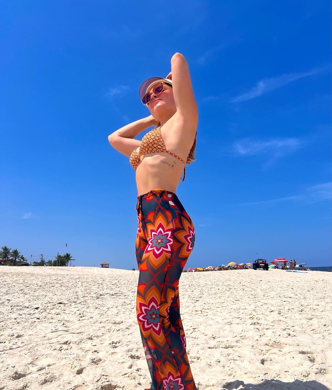 No domingo (20), a atriz Larissa Manoela aproveitou a folga para descansar na praia. Em suas redes sociais, ela compartilhou os cliques do seu biquíni com detalhes em marrom e amarelo, além de uma viseira que complementava o look.