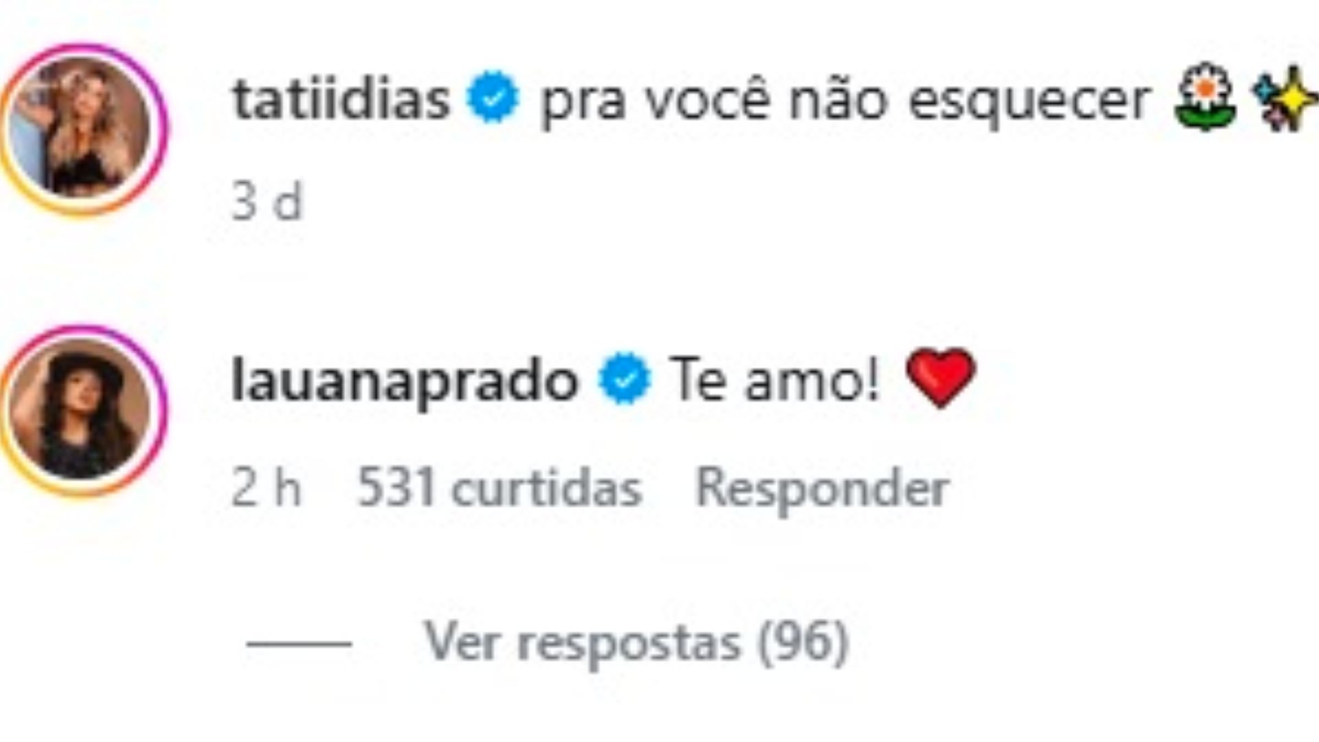 A movimentação começou quando Lauana Prado voltou a seguir Tati Dias nas redes sociais e passou a interagir com publicações da ex-companheira. Em um dos comentários, a cantora fez uma declaração direta: “Te amo!”.