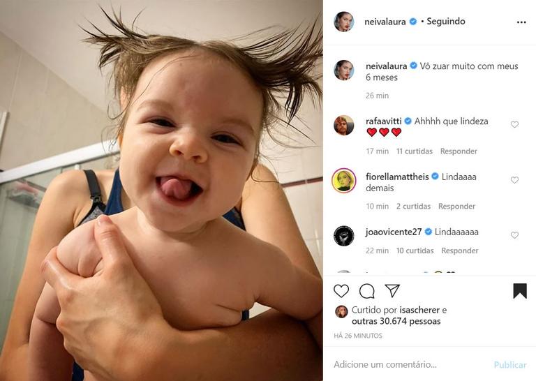 Em seu perfil do Instagram, a mamãe babona compartilhou um clique super fofo da pequena após o banho. "Vô zuar muito com meus seis meses", brincou a artista na legenda da publicação.