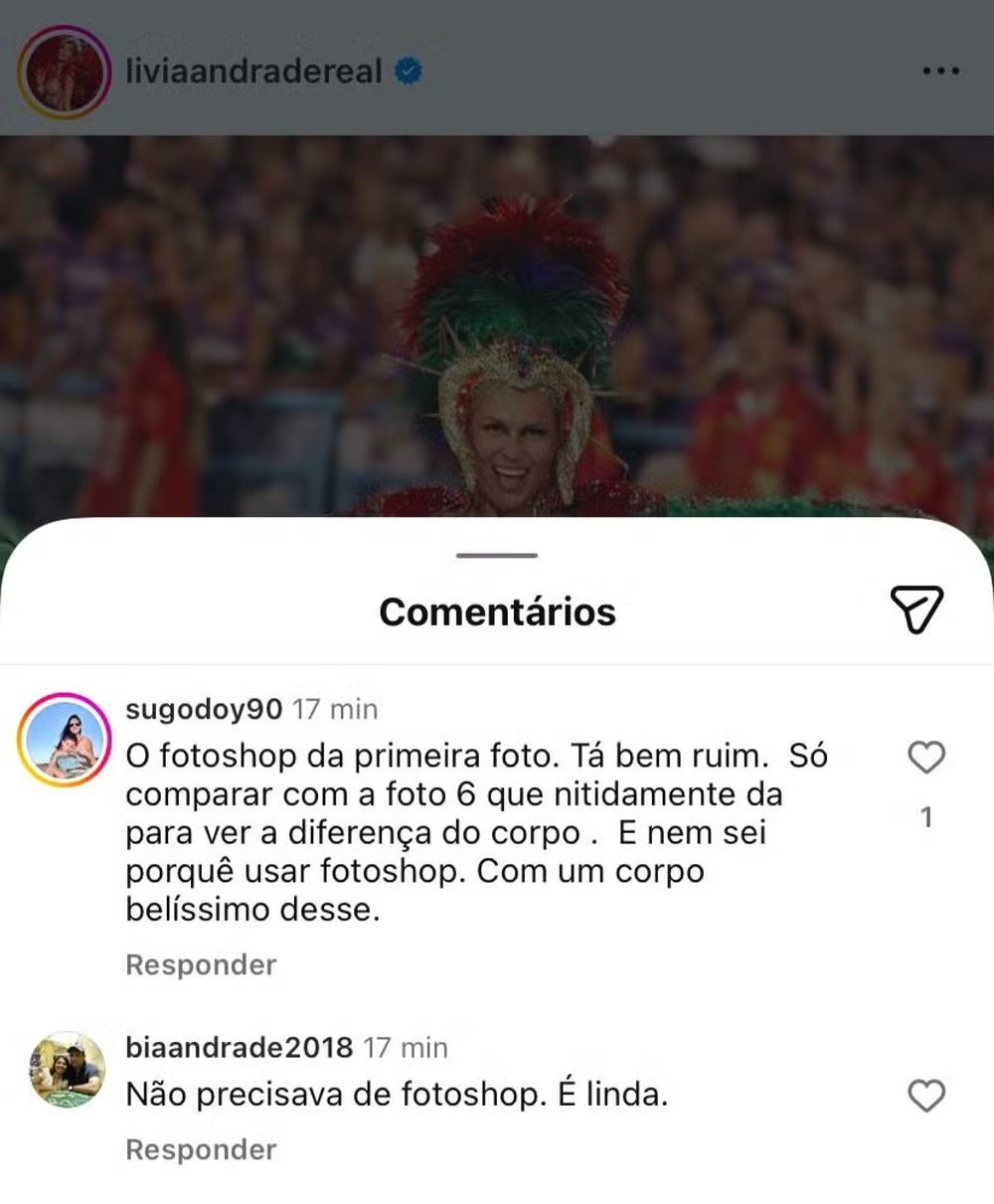Nos comentários, seguidores mencionaram o suposto uso de Photoshop e elogiaram a apresentadora. “Te acho linda, mulher! Mas você está exagerando no PhotoShop. Seu corpo não precisa disso”, escreveu uma usuária.