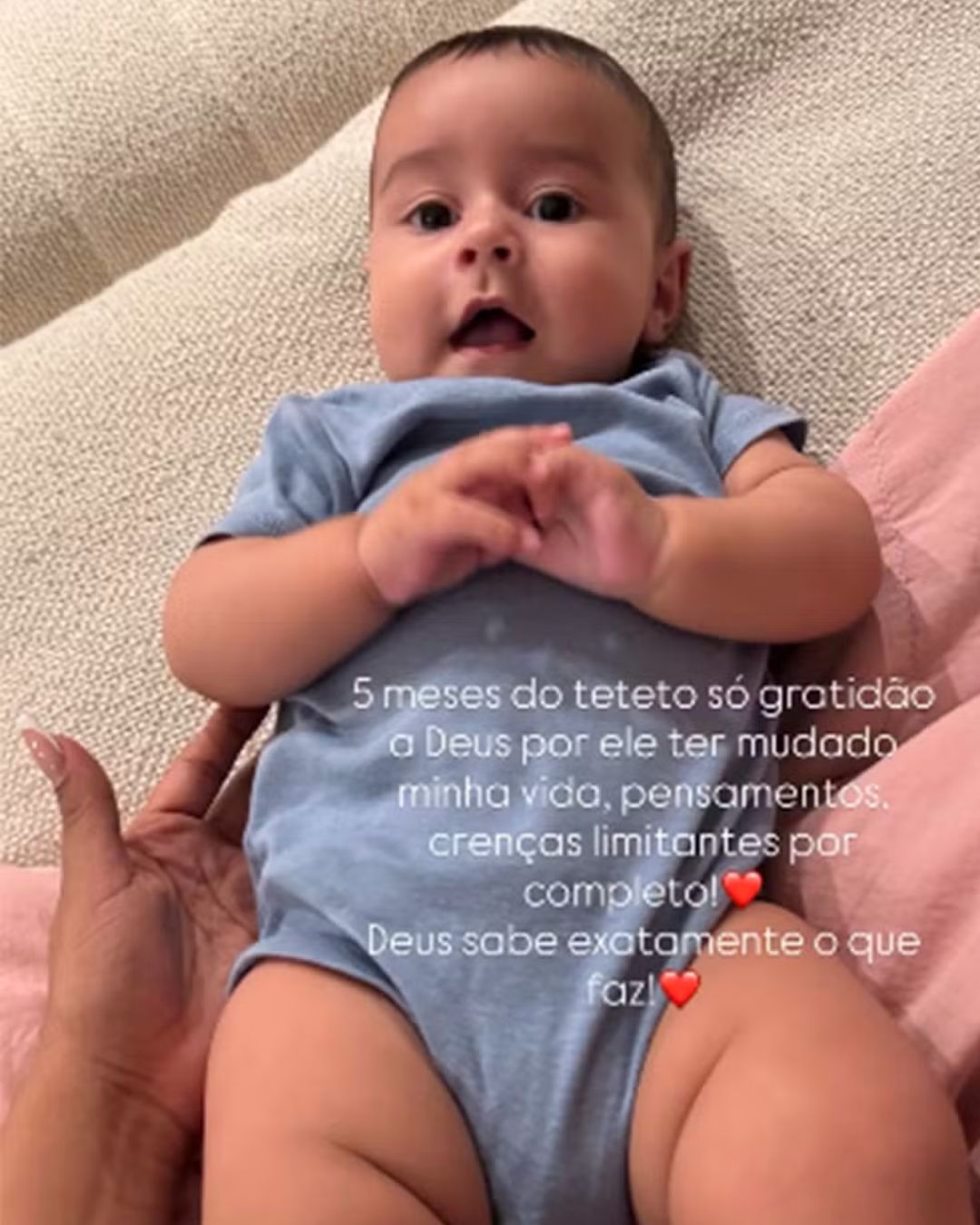"Passa tudo tão rápido", escreveu ao mostrar um momento com o filho nos braços. "Cinco meses do teteto. Só gratidão a Deus por ele ter mudado minha vida, pensamentos, crenças limitantes por completo! Deus sabe exatamente o que faz!", completou. Além disso, resgatou registros antigos com o menino e escreveu frases como "Grudadinho pra sempre" e "um anjo do senhor". Já MC Daniel, antes de dormir, afirmou: "Amanhã é mesversário do meu filho e vou ver ele, se Deus quiser".