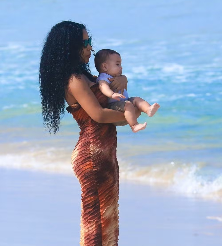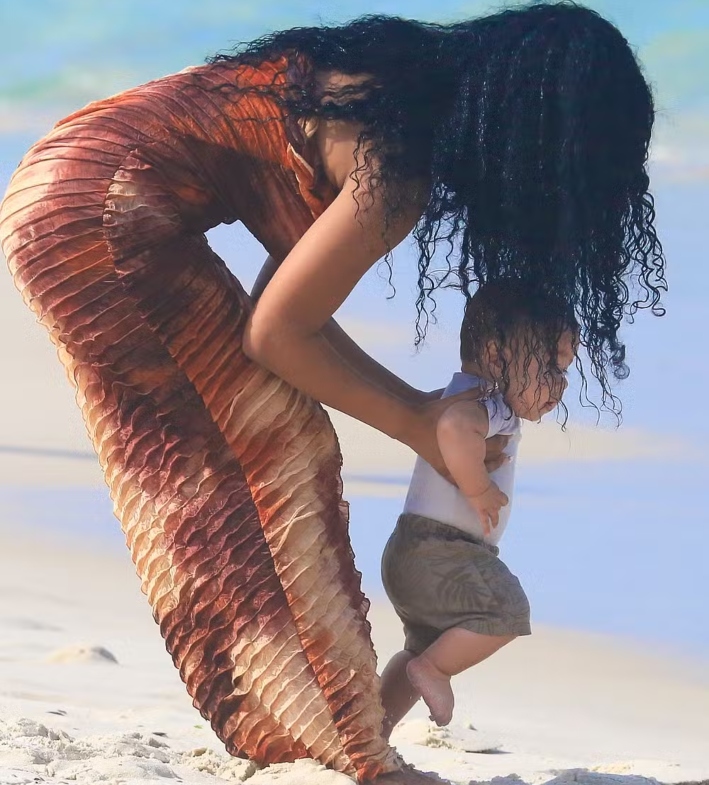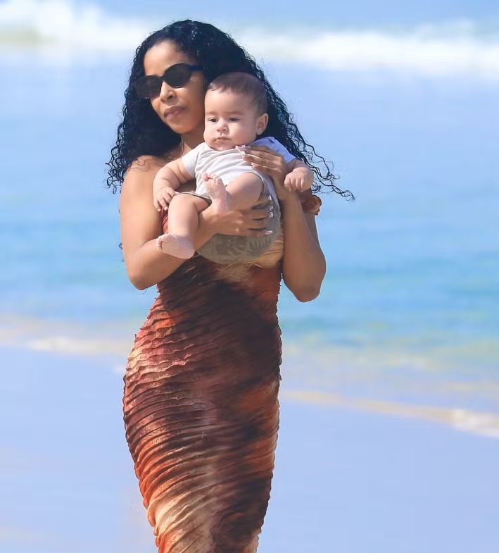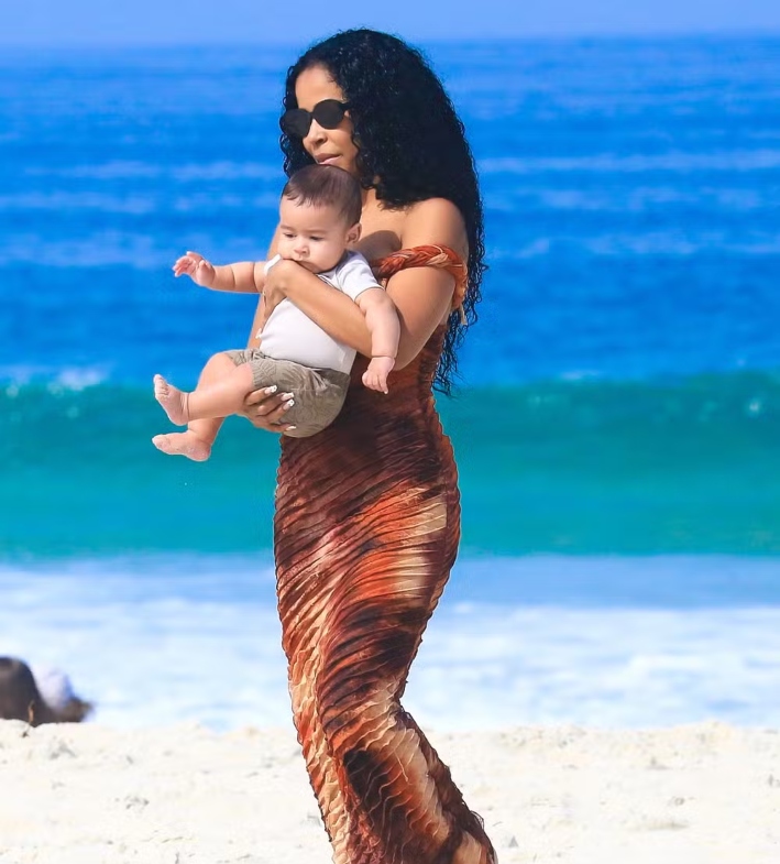 A influenciadora curtiu o passeio com o filho usando um vestido longo e óculos escuros. Ela aproveitou para pôr os pés de Rás na areia da praia. Na homenagem feita ao bebê mais cedo, ela agradeceu a Deus pela vida do filho.