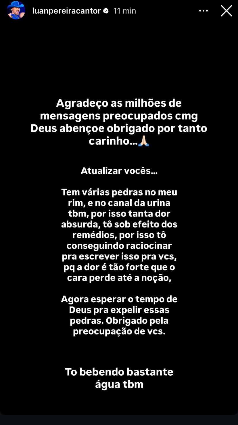 Logo depois, ele deu mais detalhes de seu estado de saúde. ''Tem várias pedras no meu rim e no canal da urina também, por isso tanta dor absurda. Tô sob efeito dos remédios, por isso estou conseguindo racionar para escrever isso pra vocês'', disse.