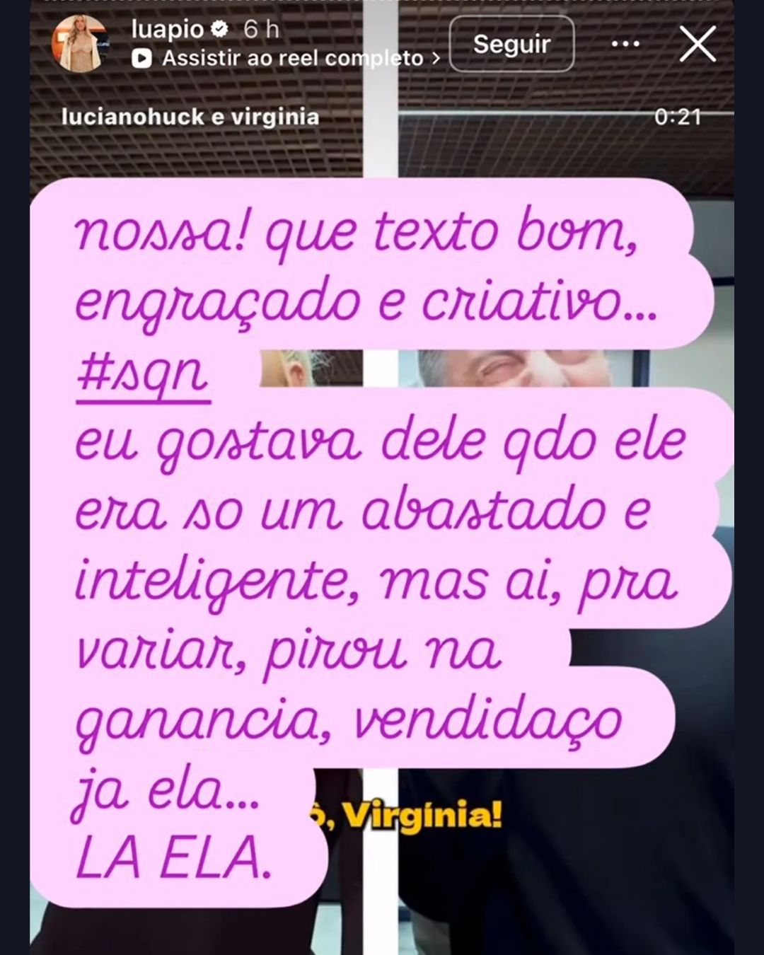 Em seu perfil no Instagram, Piovani chamou o marido de Angélica de “vendido” ao comentar a interação entre ele e Virginia. Ao repostar o vídeo promocional da participação da influenciadora no programa, escreveu: “Que texto bom, engraçado, criativo.. só que não. Eu gostava dele quando ele era só um abastado e inteligente, mas ai, pra variar, pirou na ganância, vendido, já ela… LÁ ELA”.