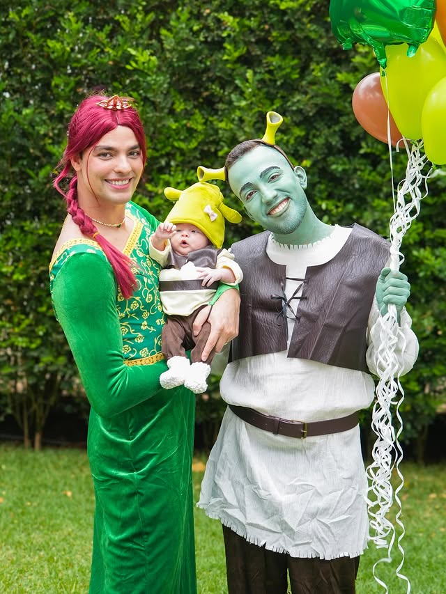 Lucas Rangel, de 27 anos, e Lucas Bley, de 32, comemoraram nesta quinta-feira (6) o primeiro mês de vida da filha, Mia, com uma festa temática inspirada em Shrek. O casal entrou no clima e se fantasiou para celebrar a data, além de gravar um vídeo divertido dublando cenas do clássico da animação.