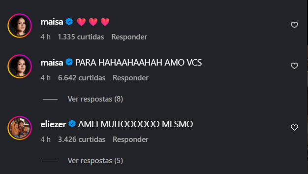 Nos comentários, amigos e famosos reagiram com bom humor à criatividade da comemoração. “Para, amo vocês”, comentou Maisa. Já Eliezer declarou: “Amei muito mesmo”.