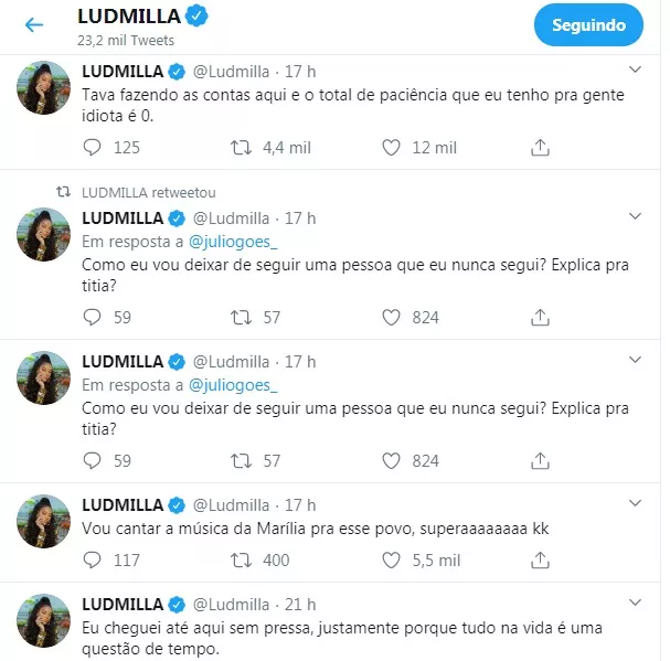 O tweet citava um vídeo de sua participação no documentário Princesas do Funk, no qual elogia a funkeira, mas parece que Lud não gostou da homenagem. Em seu Twitter, ao ser questionada sobre o motivo pelo qual teria dado unfollow na MC, Ludmilla foi direta. "Como eu vou deixar de seguir uma pessoa que eu nunca segui? Fala pra titia?", debochou.
