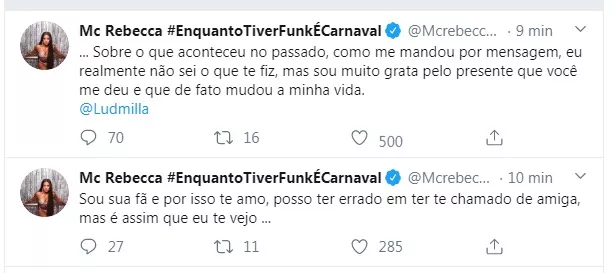 Ludmilla e MC Rebecca protagonizam um desentendimento no Twitter nesta quarta-feira (11). Tudo começou quando Rebecca fez uma publicação na rede social na terça (10) dizendo o quanto admirava a cantora de Verdinha, agradecendo a ajuda que recebeu dela e chamando-a de amiga. As informações são da Quem.