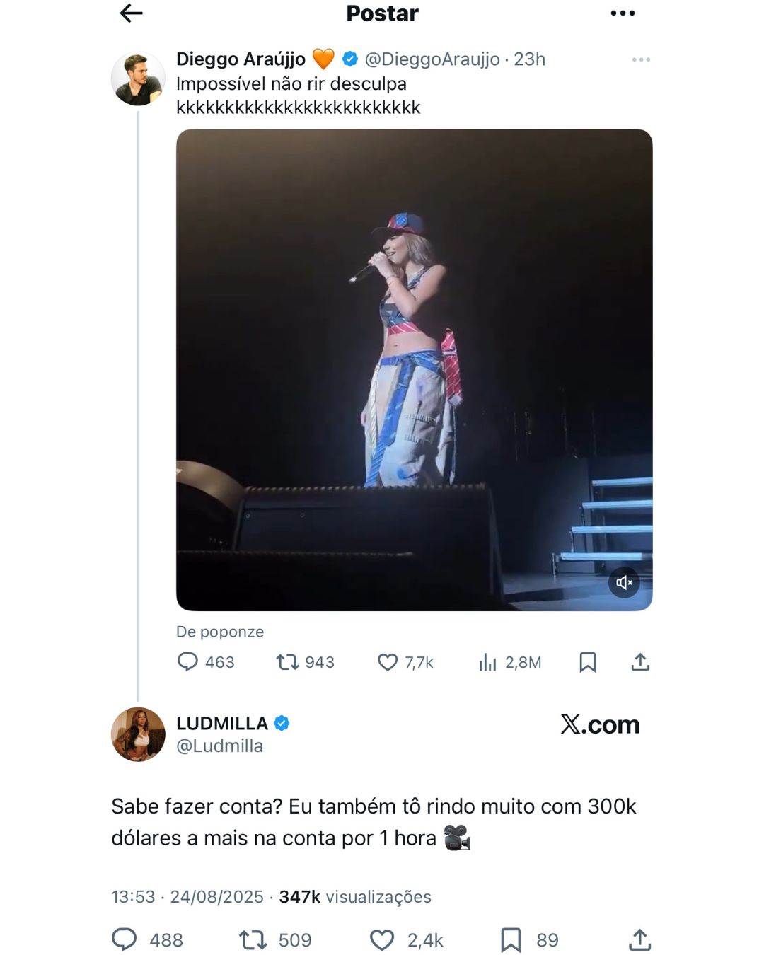 Ludmilla reagiu de forma direta à provocação e destacou o cachê milionário recebido pela apresentação internacional. "Sabe fazer conta? Eu também tô rindo muito com 300 mil dólares a mais na conta por 1 hora", rebateu a cantora, arrancando risadas e apoio de seus seguidores.