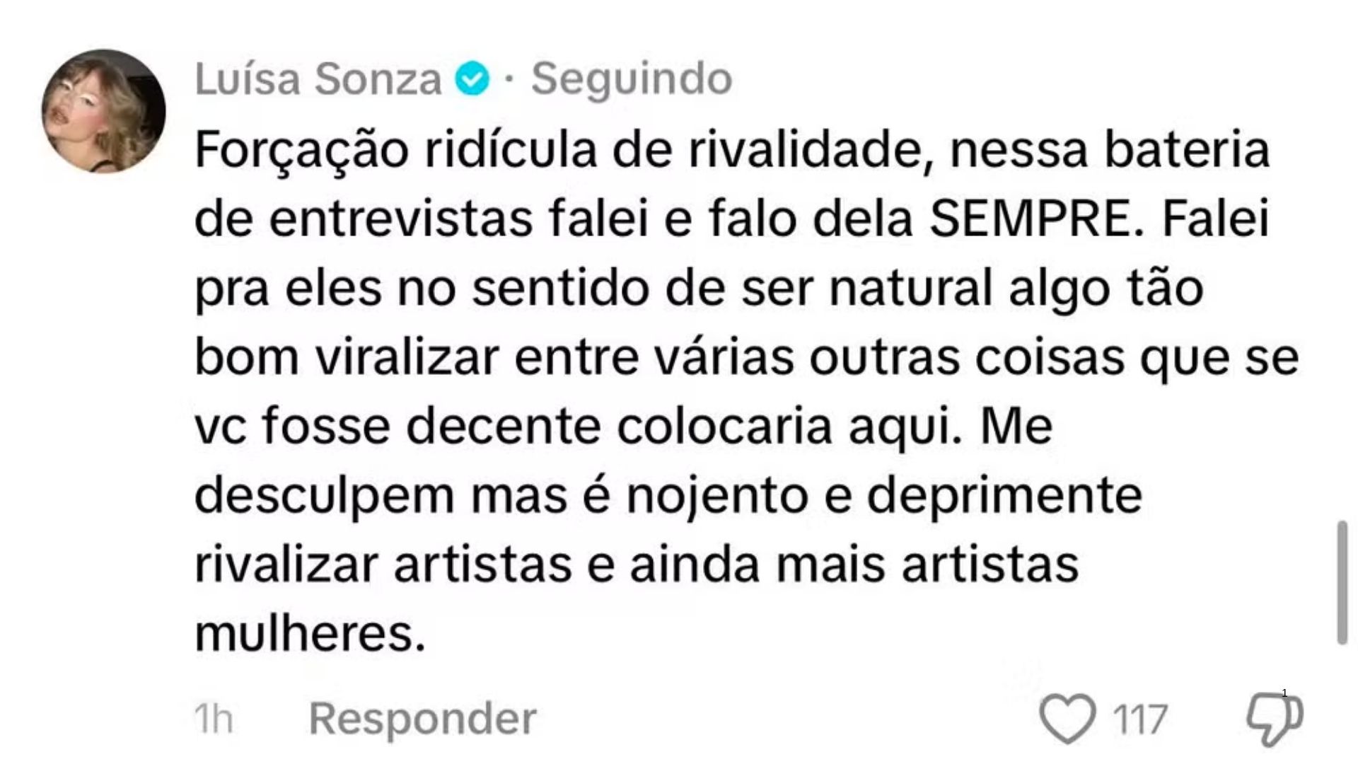 Sem deixar que a rivalidade avançasse, Luísa respondeu diretamente à publicação. "Forçação ridícula de rivalidade, nessa bateria de entrevistas falei e falo dela SEMPRE. Falei pra eles no sentido de ser natural algo tão bom viralizar entre várias outras coisas que se vc fosse decente colocaria aqui. Me desculpem mas é nojento e deprimente rivalizar artistas e ainda mais artista mulheres", escreveu a cantora, demonstrando incômodo com a situação.
