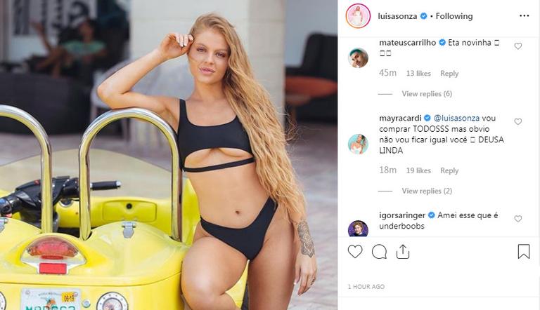 Luísa Sonza surpreendeu com uma novidade e principalmente com seu corpão. A cantora compartilhou nesta segunda-feira, 1, um clique bem ousado em que apareceu com um biquíni diferente. A peça, que é de uma coleção sua, mostrou parte dos seios dela.