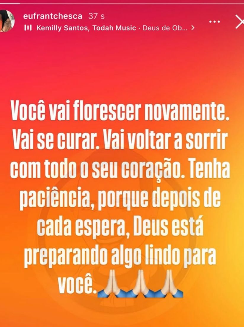 “Você vai florescer novamente. Vai voltar a sorrir com todo o seu coração. Tenha paciência, porque depois de cada espera, Deus está preparando algo lindo para você”, escreveu.