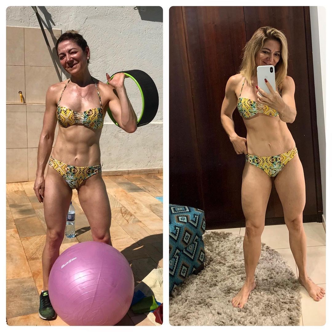 "Se tenho alguma dúvida? Entre continuar com um shape mais sequinho, (2018) com os gominhos bemm aparentes, com um índice de gordura corporal de 9% ou menos (não me lembro exatamente) ou o shape de agora com um abdômen não tão definido, com um índice de gordura que vou chutar kkkk 12%. Confesso que não tinha isso em mente não. Quando entrou a pandemia já não estava mais tão sequinha, mas até então eu queria voltar a ficar, contudo pensei, como vou fazer isso treinando em casa, e ainda com as alterações hormonais (entra e não entra na menopausa). Então gente, com o passar do tempo, fui olhando no espelho, fazendo fotos, e gostando do que estava vendo, me sentindo mais bonita, mais mulherão sabe!? E sem falar que o psicológico conta muito, porque dependendo de como ele está, não ficamos nunca satisfeitas não é? Então, no momento não tenho nenhuma dúvida, me amando como estou agora! Pode ser que ainda, quem sabe, eu queira em algum momento dar uma secadinha, me desafiar kkkk. O que acham? Boa noite!"