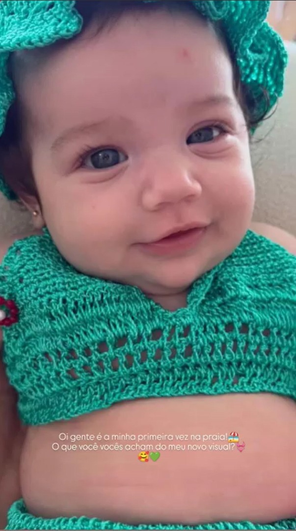 O momento foi compartilhado nesta sexta-feira (13) por Genilda Fernandes, avó da bebê, por meio dos stories do Instagram. Na imagem, Zuza aparece usando uma delicada roupinha de crochê enquanto aproveita o passeio: “Oi, gente. É a minha primeira vez na praia! O que vocês acham do meu novo visual?”.escreveu
