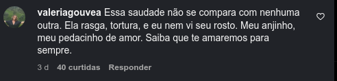 Valéria revelou que vinha se preparando para a chegada de Rael e que seria a avó mais ‘serelepe’. "Resolvi, aos 63 anos, fazer uma 'lanternagem' completa. Seria a vó mais serelepe do mundo. Imaginava ele correndo pela grama, vendo meus amigos miquinhos, os esquilos, os passarinhos. Ah, Rael, se tu soubesse como te amo", completou. "Essa saudade não se compara com nenhuma outra. Ela rasga, tortura, e eu nem vi seu rosto. Meu anjinho, meu pedacinho de amor. Saiba que te amaremos para sempre", declarou.