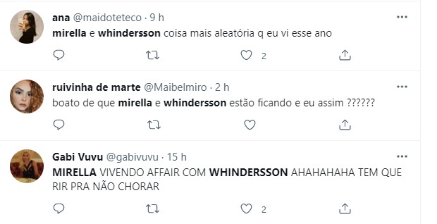 Na web, muitos ficaram surpresos com as notícias e não se conformaram com o suposto novo casal. "Whindersson e Mirella pra mim é muito vibes Selena e Faustão: aleatório, perfeito pras fic da minha cabeça", brincou um. "Gente, que história é essa de Mirella e Whindersson? Esse quebra-cabeça está confuso e quem começou vai ter que desvendar", pediu outo. "Whindersson e MC Mirella, se tem casal mais improvável, acho que acabei de achar", comentou outro.