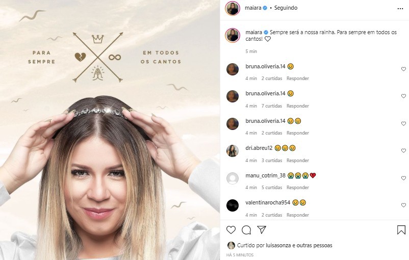 Maiara fez uma homenagem para Marília Mendonça. "Sempre será a nossa rainha. Para sempre em todos os cantos!", escreveu a sertaneja. Até este domingo (7), a sertaneja não havia se manifestado nas redes sociais sobre a morte da amiga.