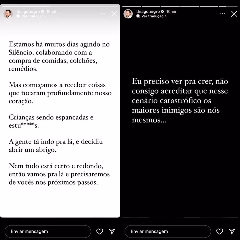 Nas redes sociais, o casal relatou que tem contribuído financeiramente e sem divulgação até o momento, mas sentiu a necessidade de ajudar presencialmente no local da tragédia.