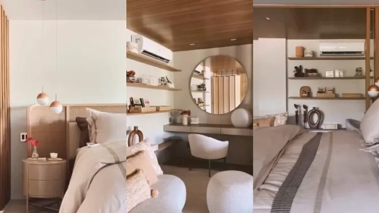 Quarto do casal possui paleta de cores claras e texturas naturais. Paolla mantém um espaço reservado na varanda de seu quarto para um altar ecumênico. Área externa tem piscina e espaço gourmet.