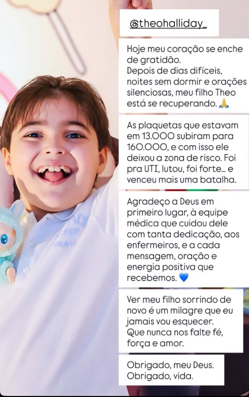 “Hoje meu coração se enche de gratidão. Depois de dias difíceis, noites sem dormir e orações silenciosas, meu filho Theo está se recuperando. As plaquetas que estavam em 13.000 subiram para 160.000, e com isso ele deixou a zona de risco. Foi para a UTI, lutou, foi forte… E venceu mais uma batalha”, explicou.