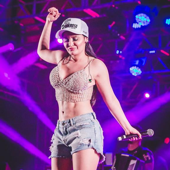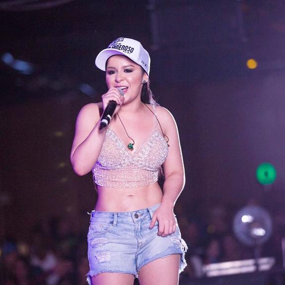 A cantora Maraísa escolheu um look minúsculo para apresentar o show com a irmã, Maiara, na noite da última terça-feira (19). A musa surgiu com a barriguinha trincada de fora ao usar top curtinho e shortinho jeans.